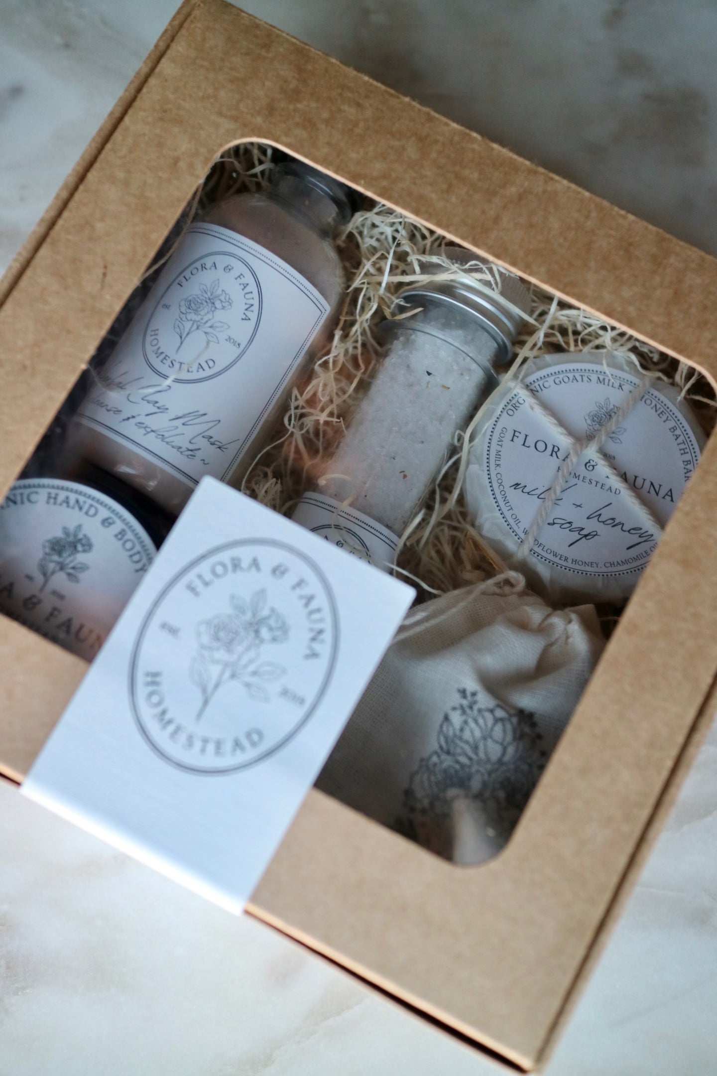 Herbal Clay Mask, Lavender & Honey Sugar Scrub, Wildflower Bath Soak, Milk & Honey Soap Bar, Lip Softener