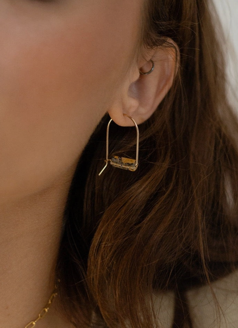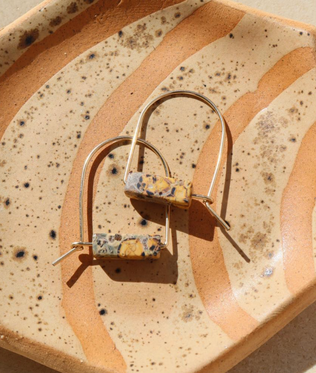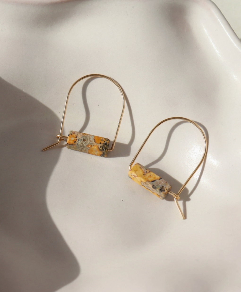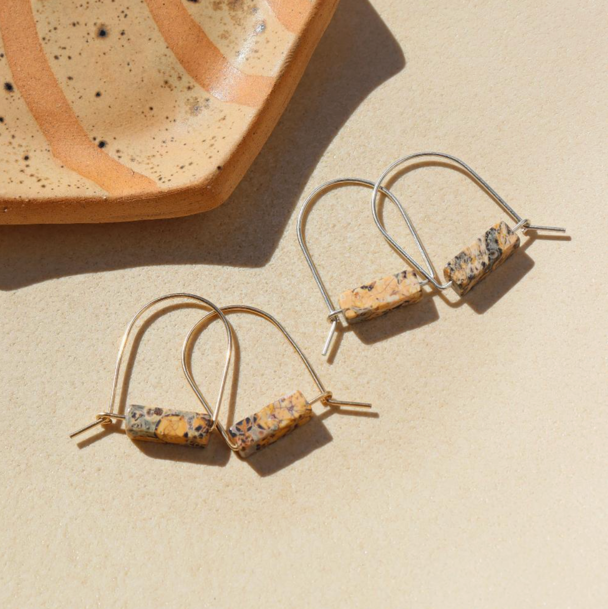 These arc-shaped hoops, in 14k gold fill feature a gorgeous leopard skin jasper stone. The rich, earthy tones of the jasper are perfect for adding a touch of autumnal flair to your daily stack.