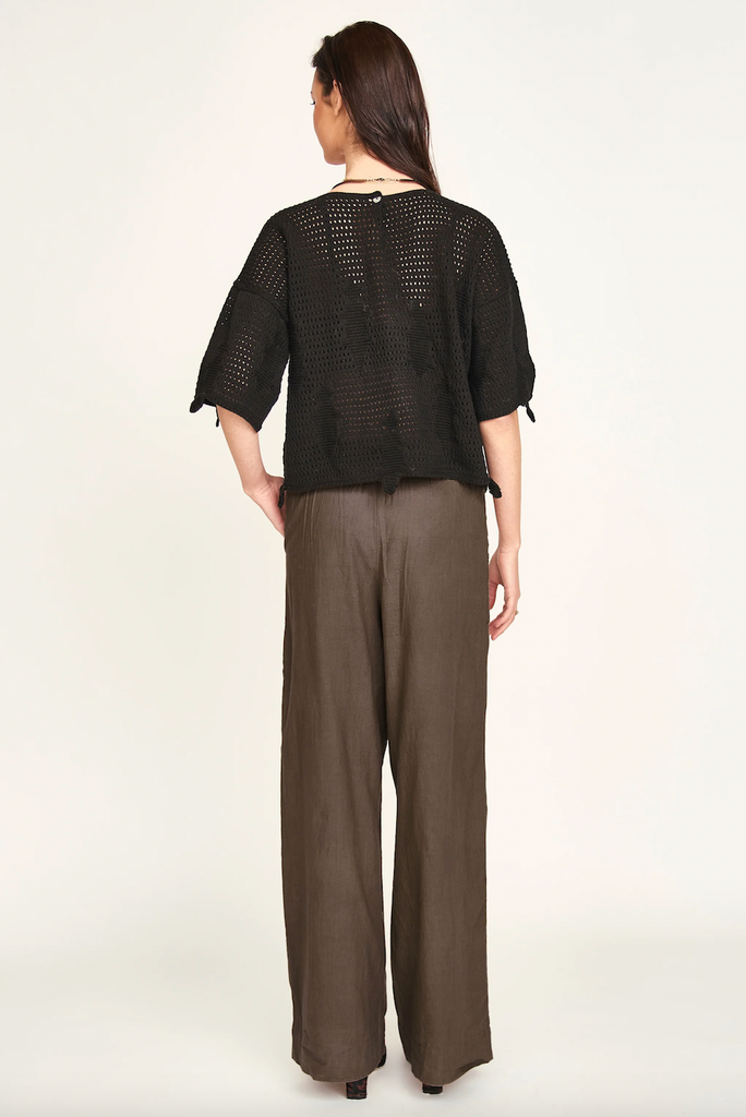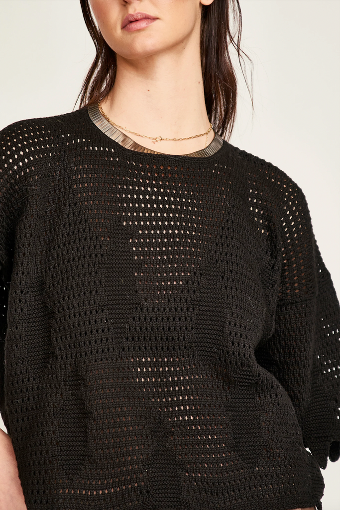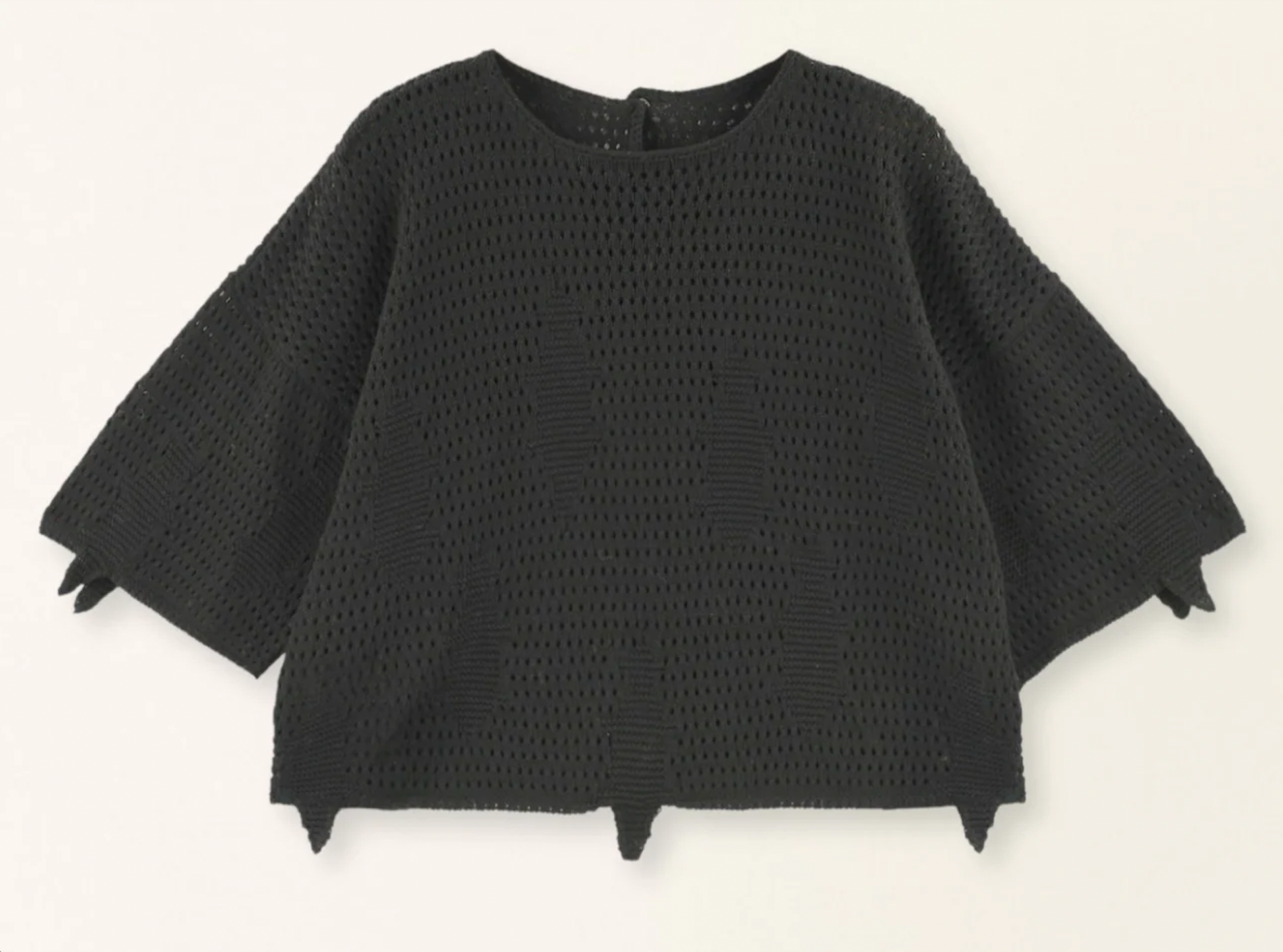 Sheer pointelle knit dolman sleeve top a button and slit at back neck. Unique abstract lizard motif with scalloped hemline and at sleeve hem