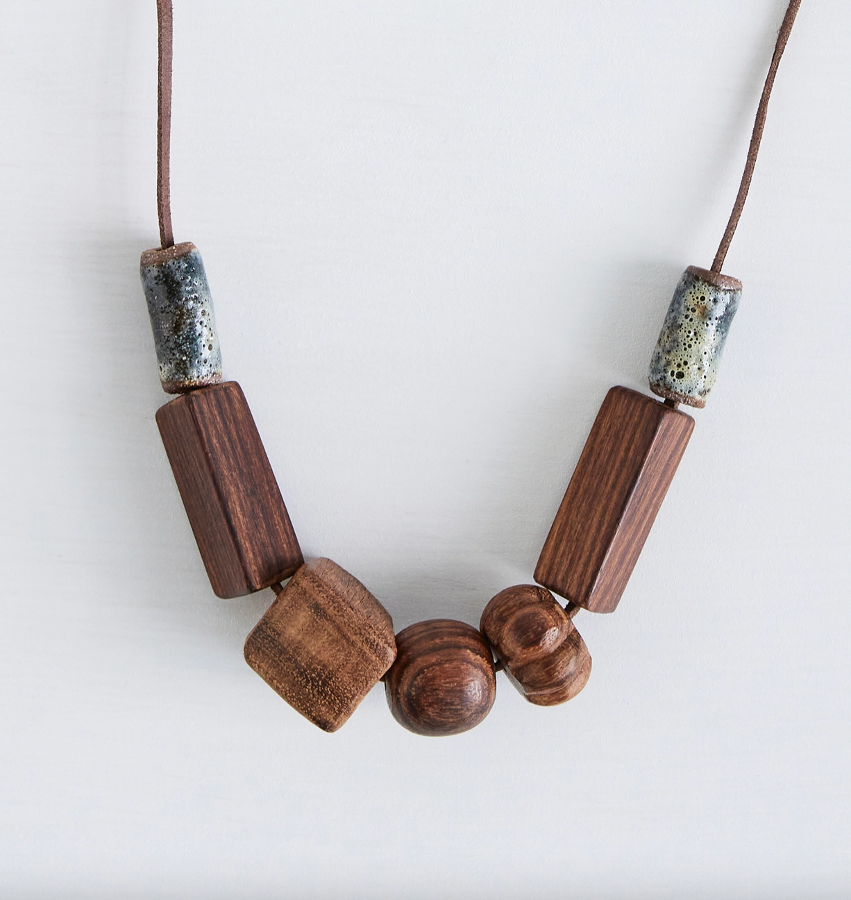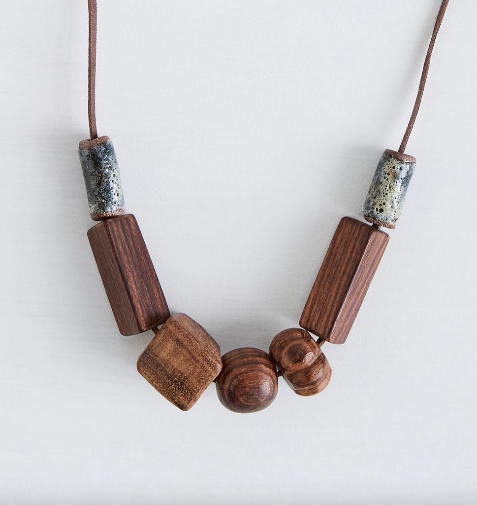 Made honestly and ethically using natural wood, ceramic stoneware, naturally dyed leather cord and an adjustable sterling silver clasp.