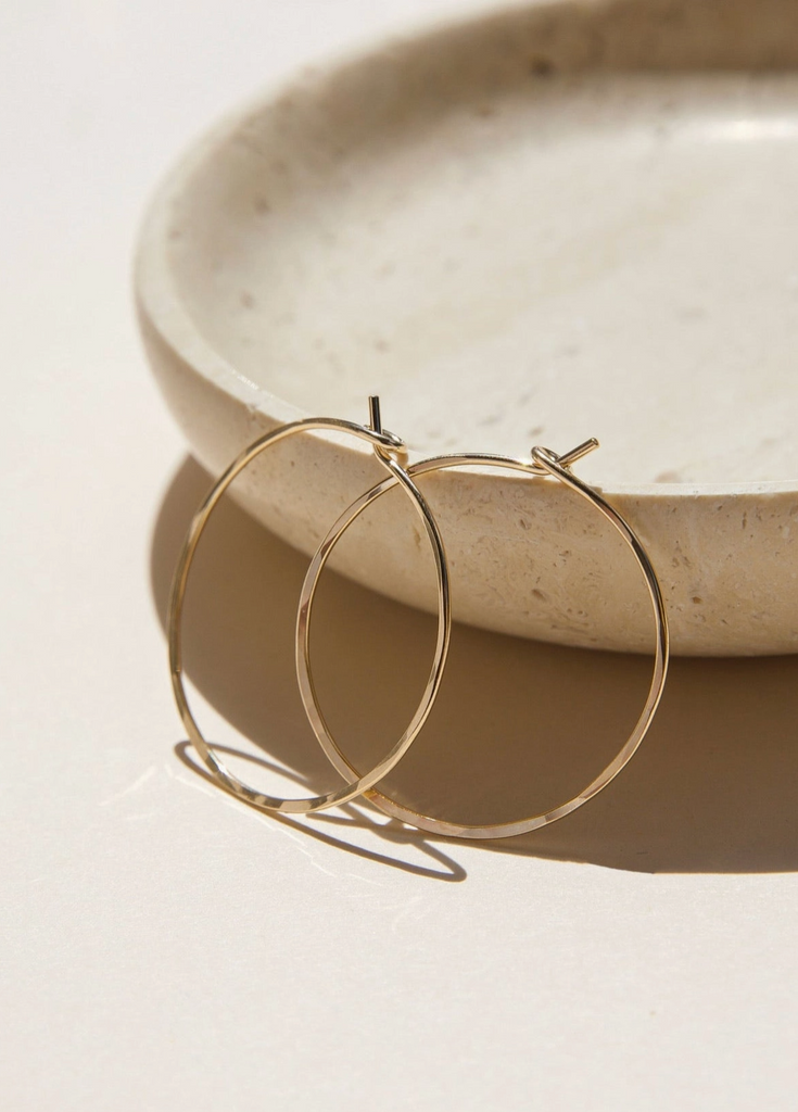 Hand-crafted, lightly hammered hoops. Available in 14k gold-filled or sterling silver.