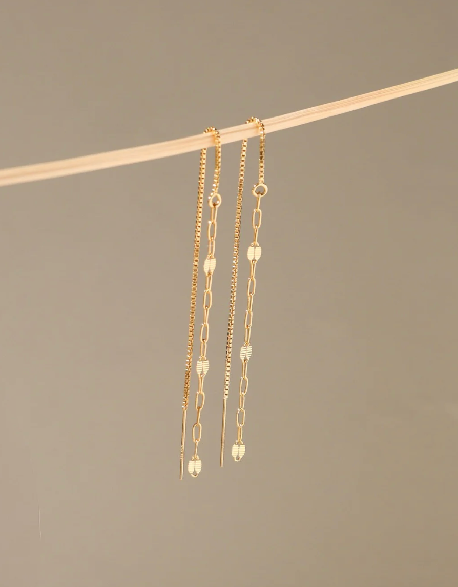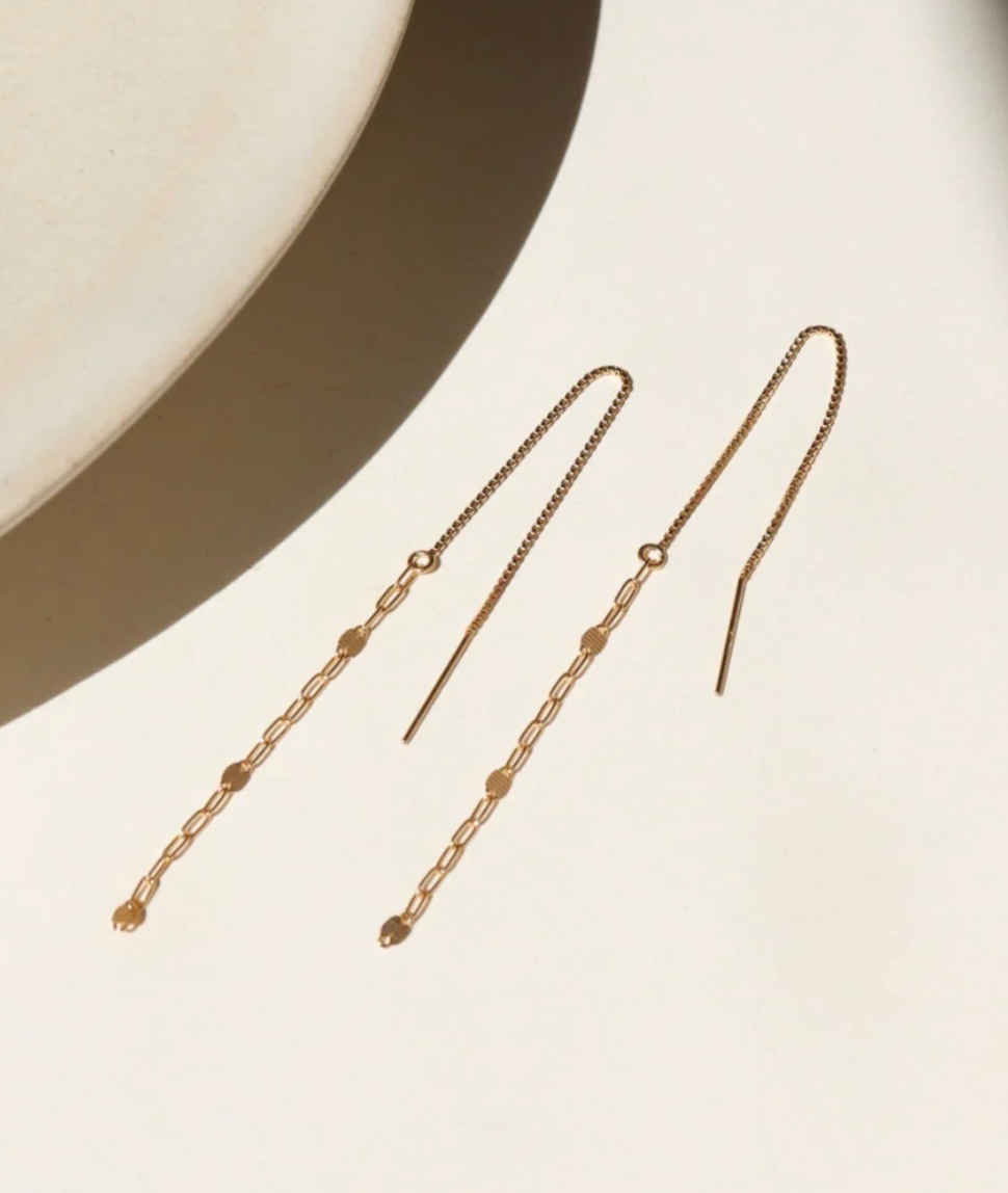 The Sunspell Threaders are light-as-air and made to move, catching the sun (and compliments) with every step. Crafted in 14k gold fill, these delicate earrings glide effortlessly through your lobe for a barely-there feel and all-day shine.