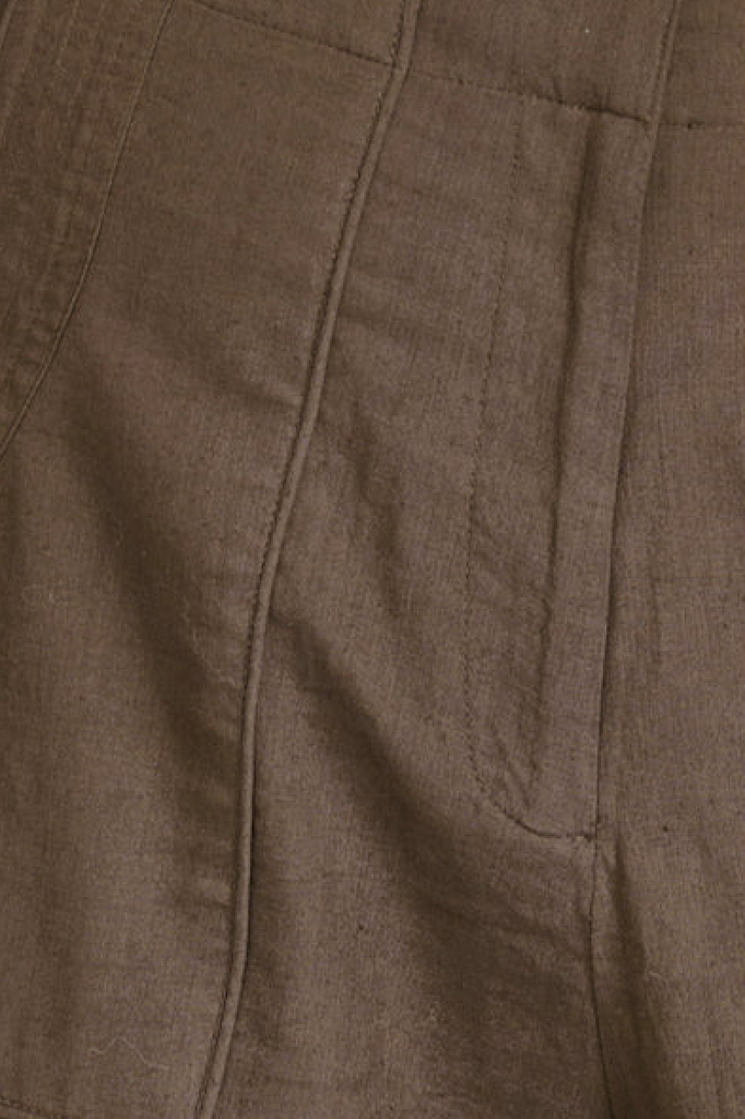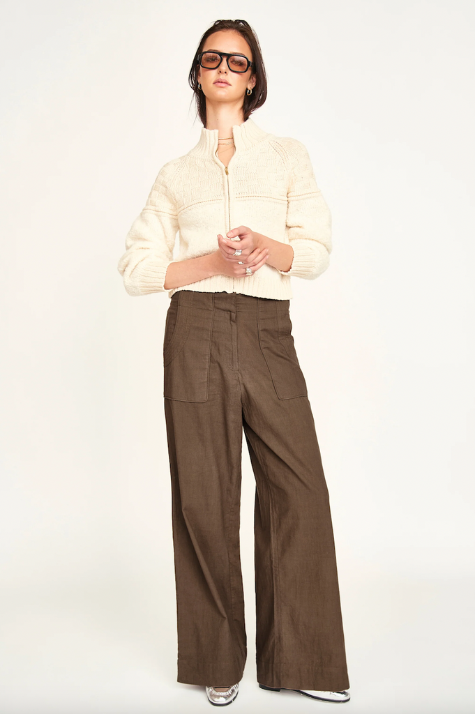 Long straight leg trouser with zipper & tab closure. Front pockets with top stitching and pipine detail