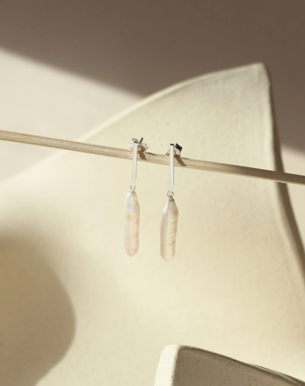 The Trace Earrings feature a linear square-wire post with a luminous elongated pearl drop.