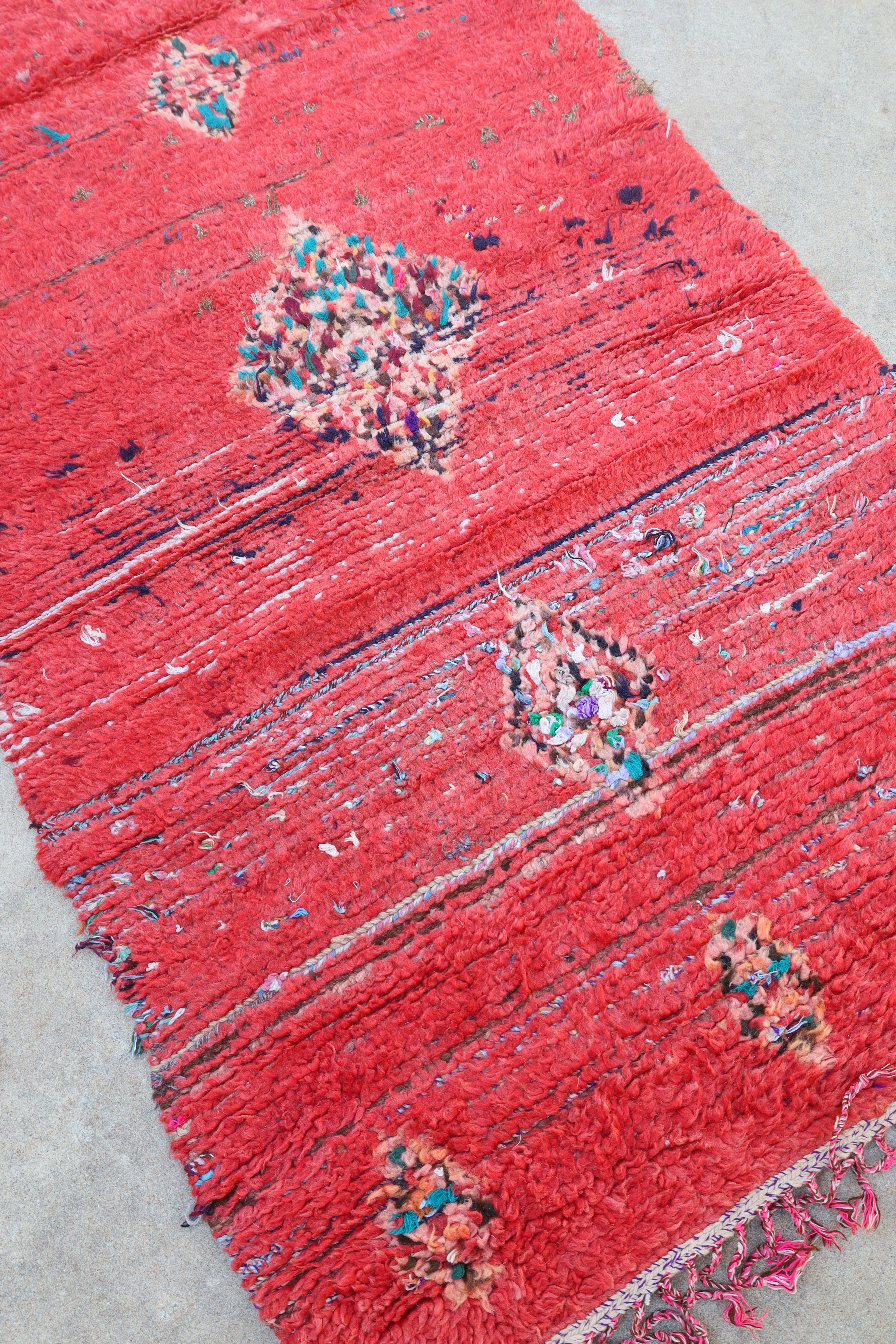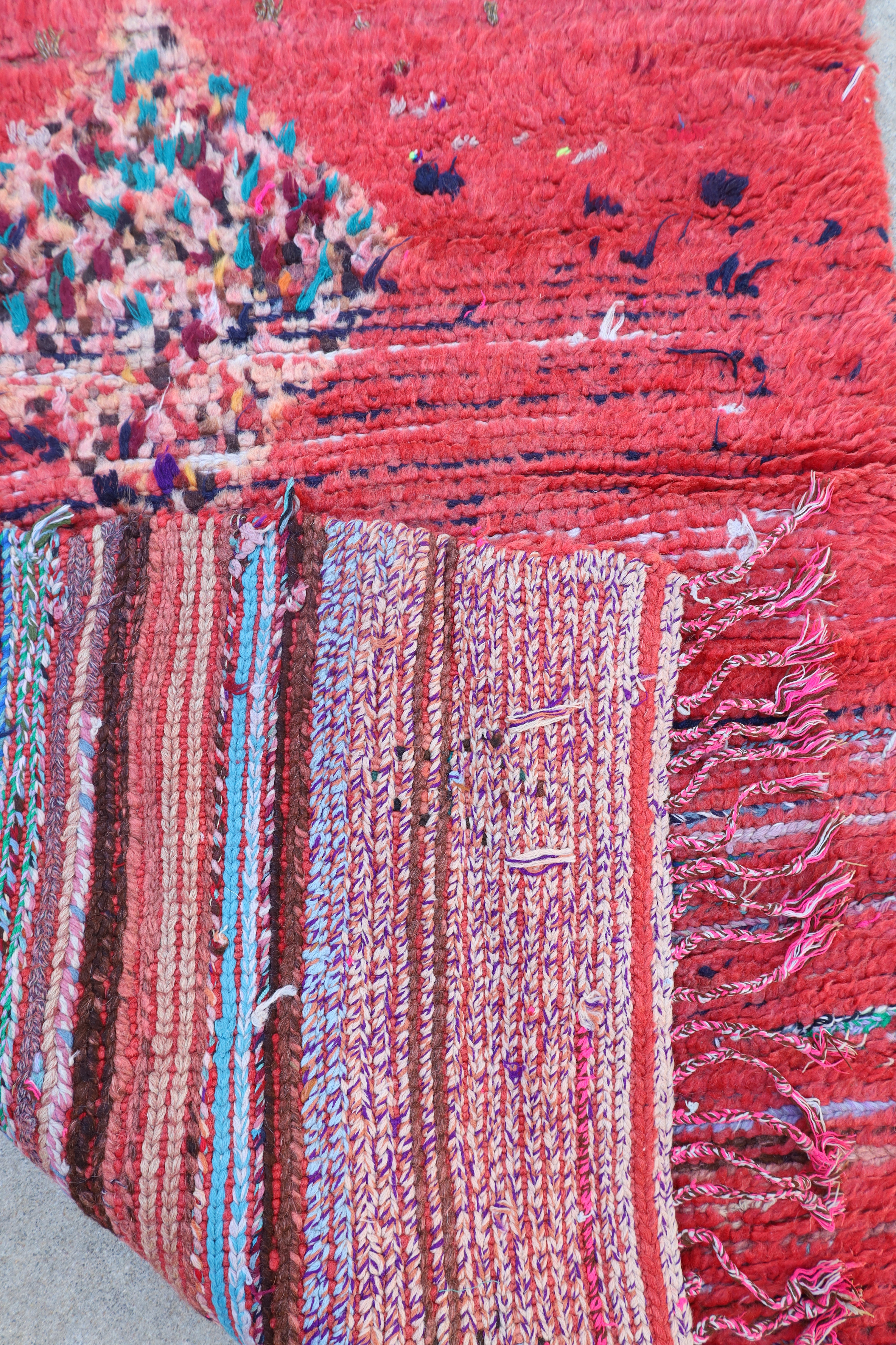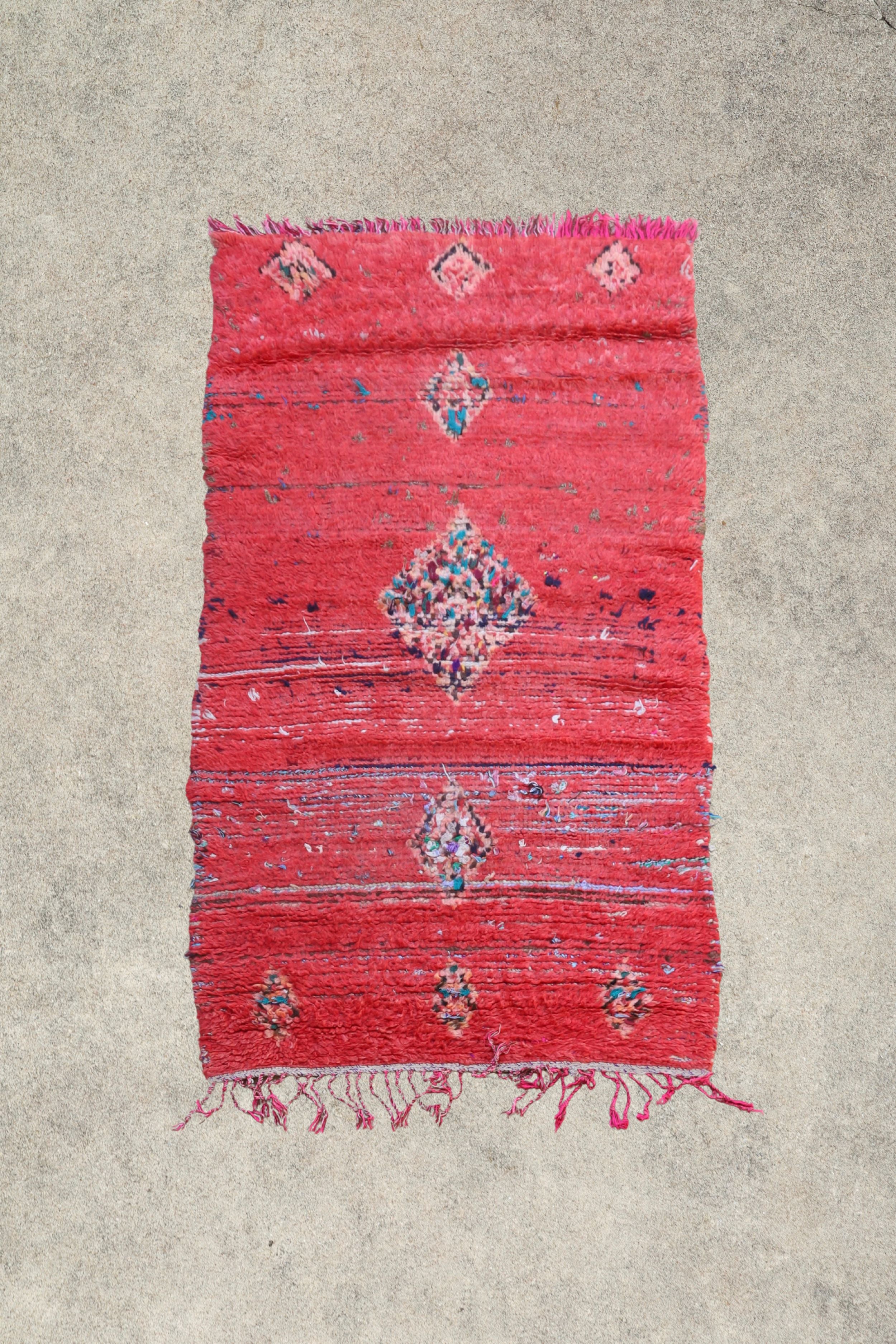Fiery is a bold find from the Boujad region in Morocco. Its bright reddish pink is paired with blue tones that you can see from the areas of wear. It would truly light up a room!