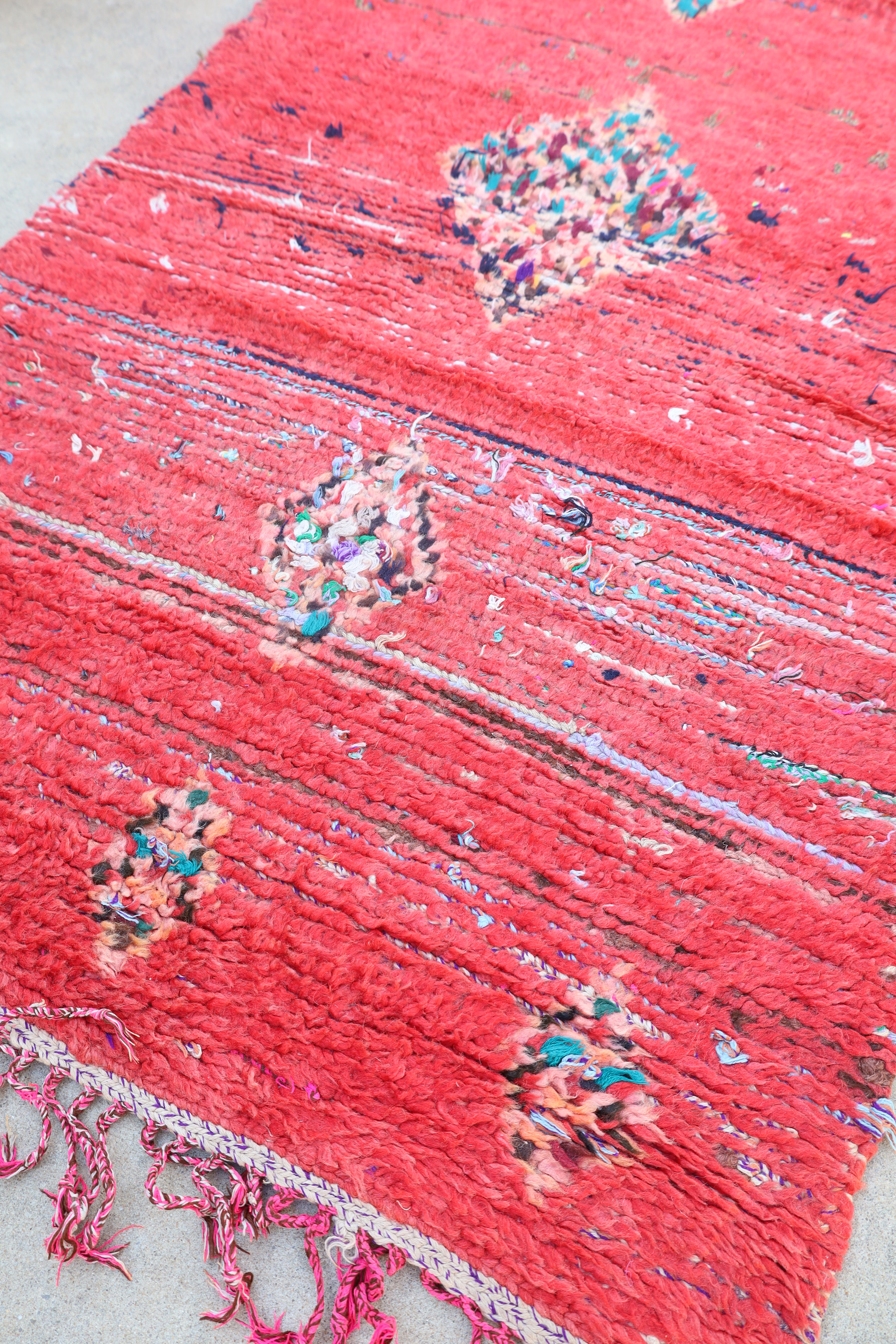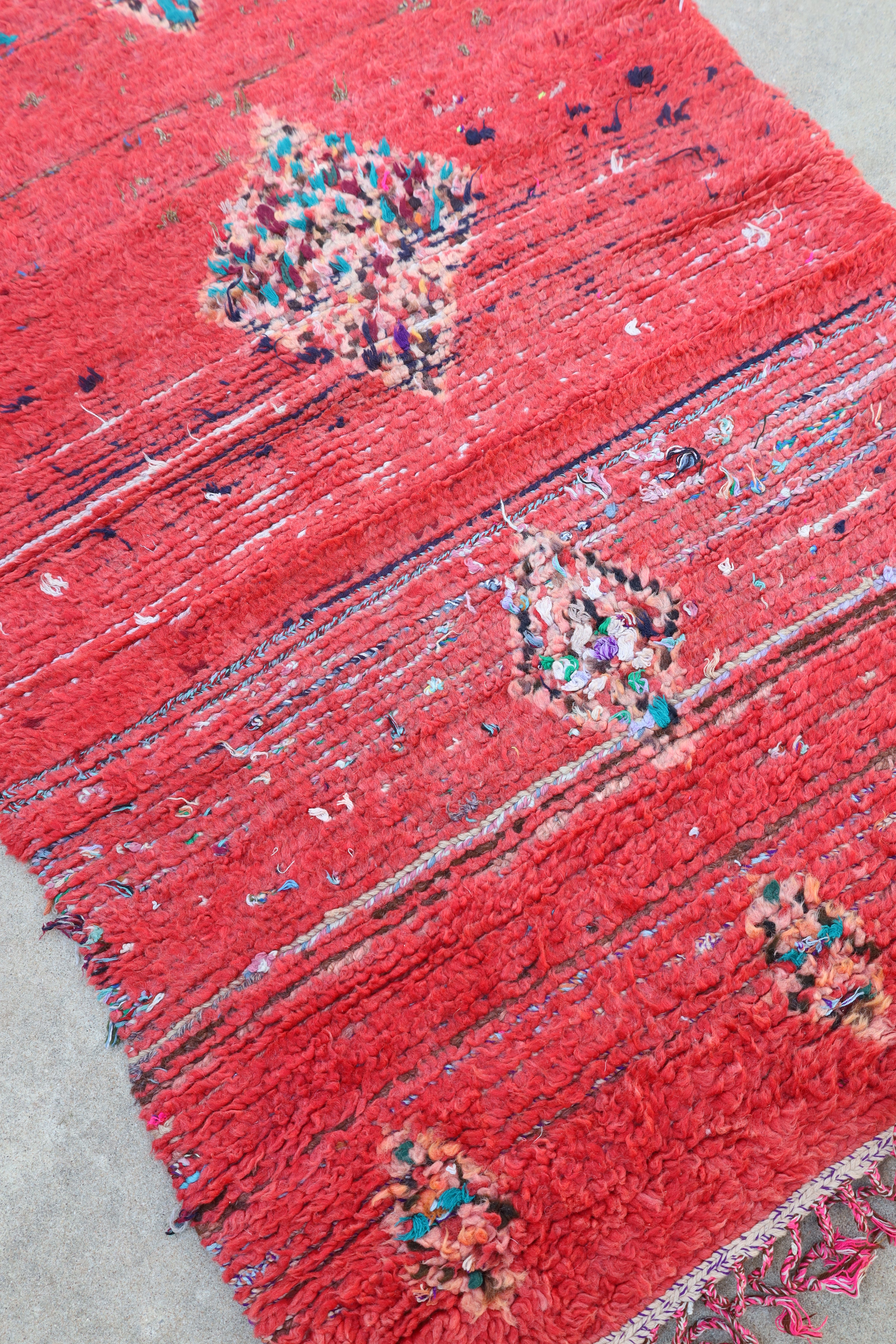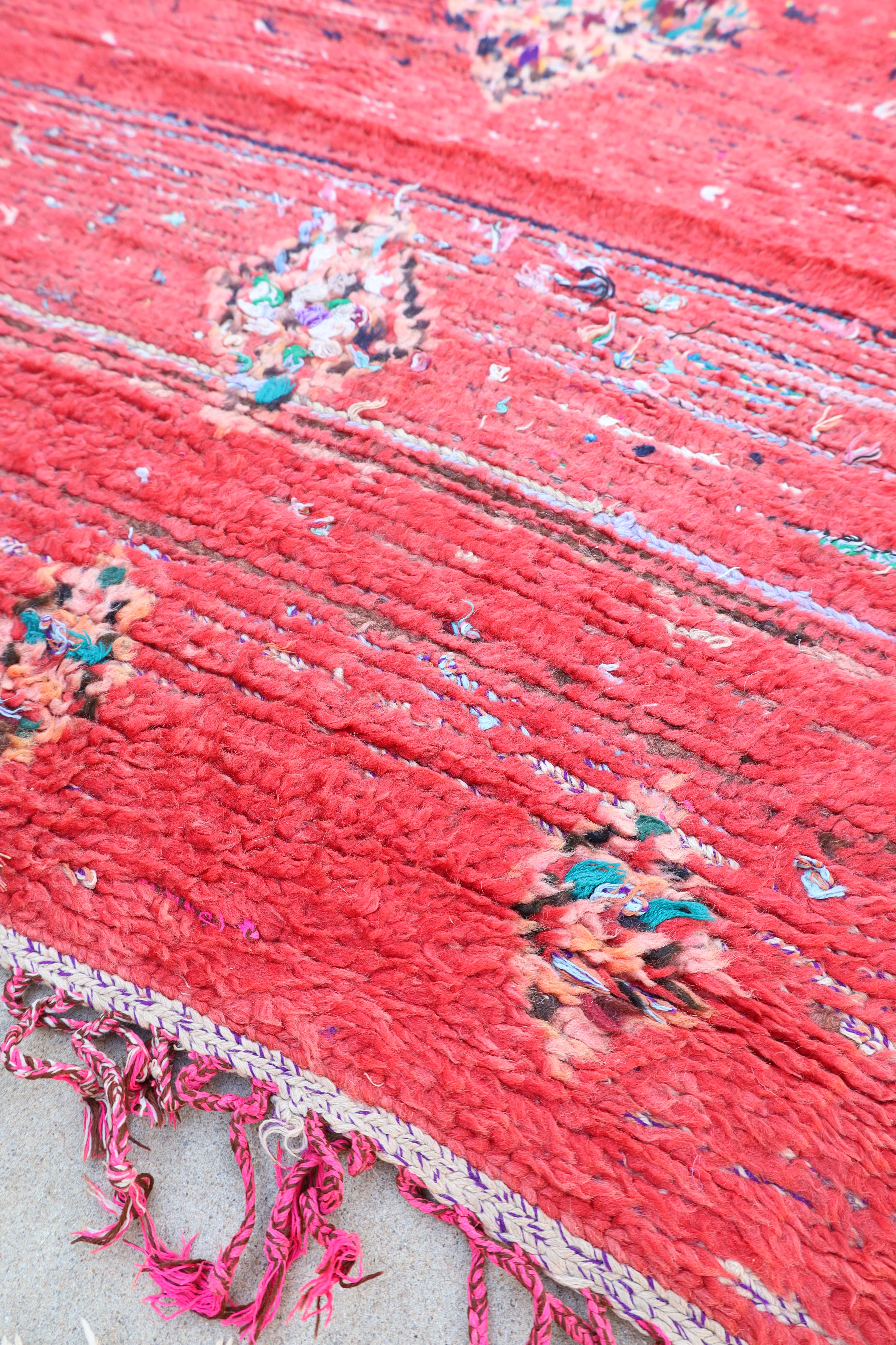 Fiery is a bold find from the Boujad region in Morocco. Its bright reddish pink is paired with blue tones that you can see from the areas of wear. It would truly light up a room!