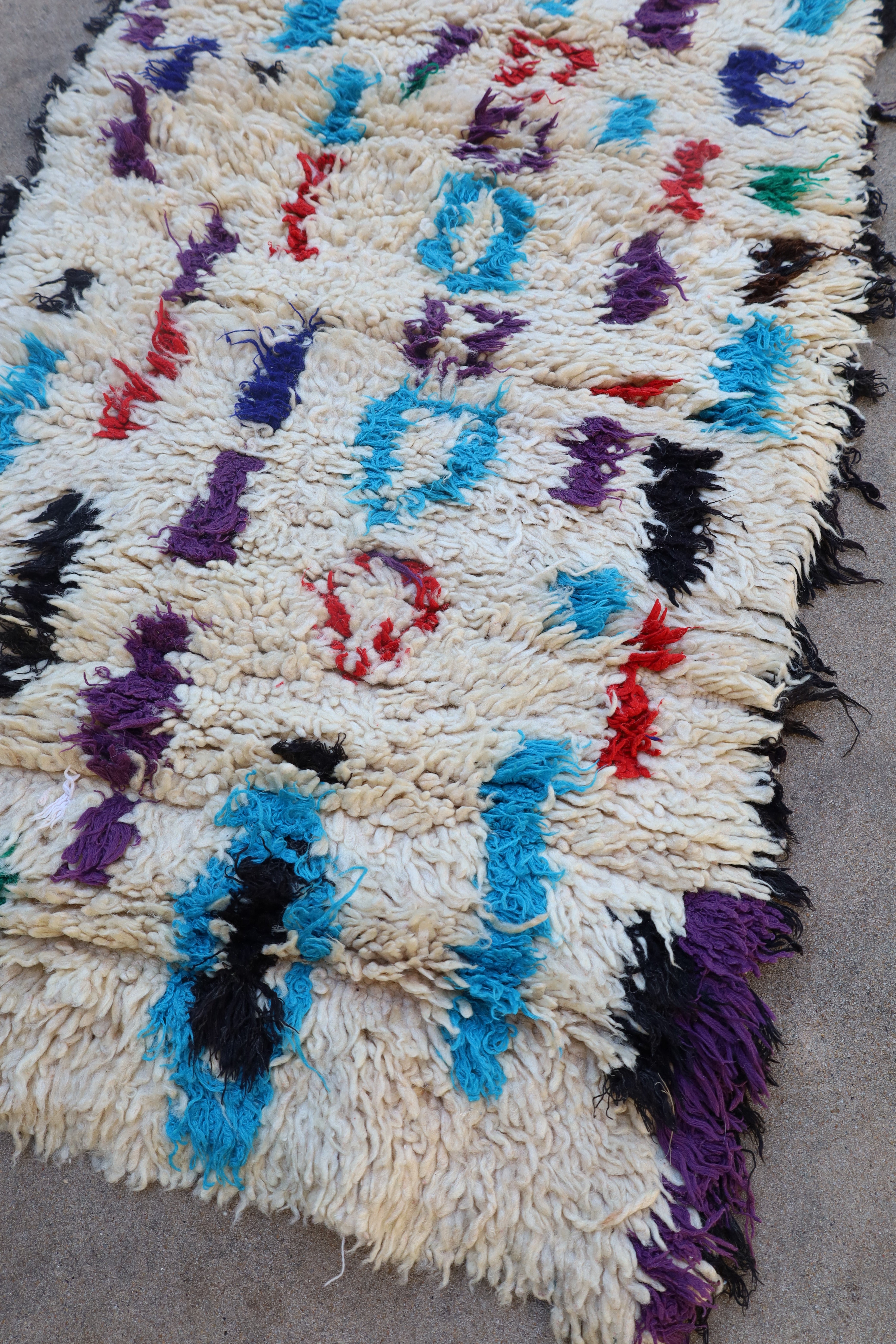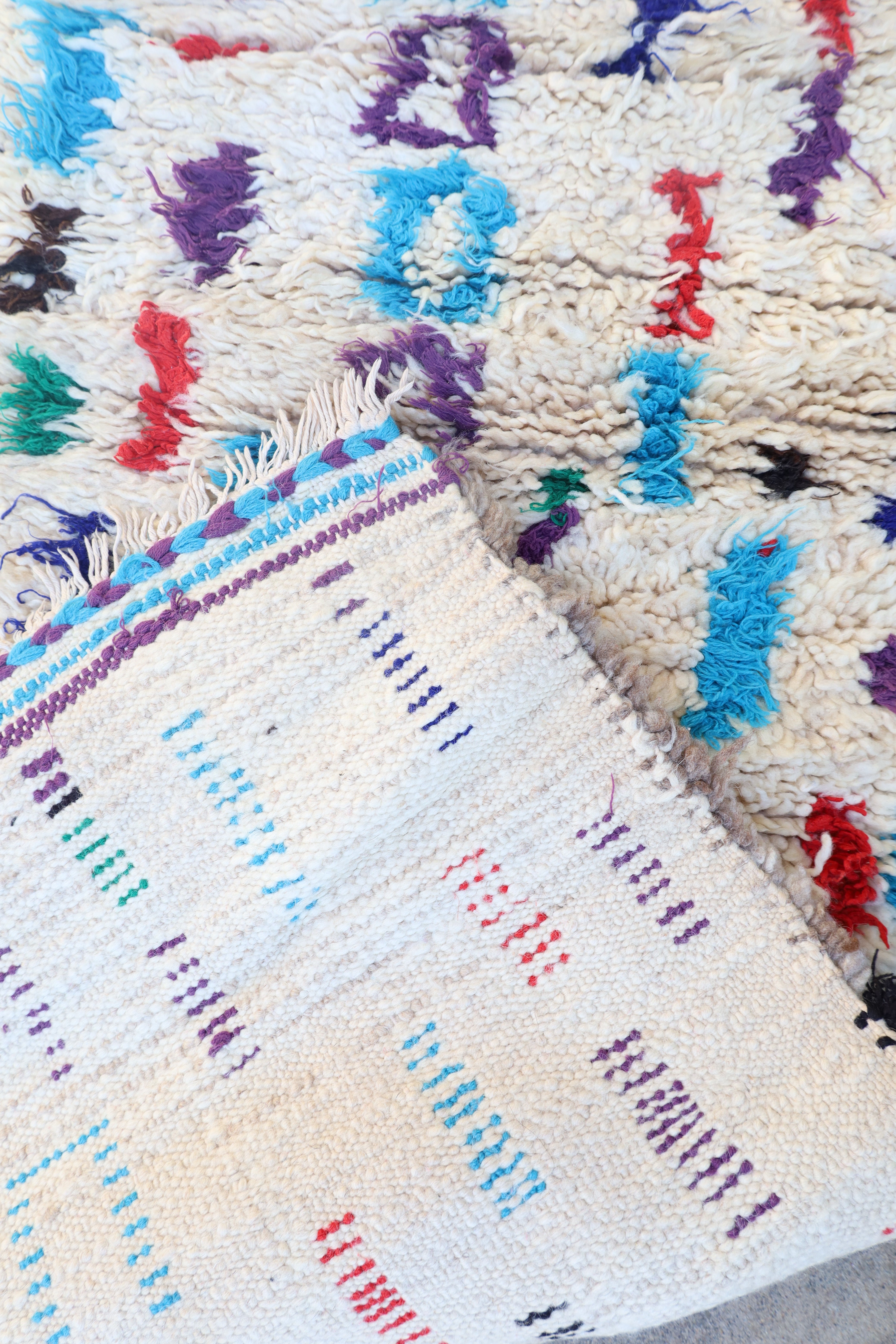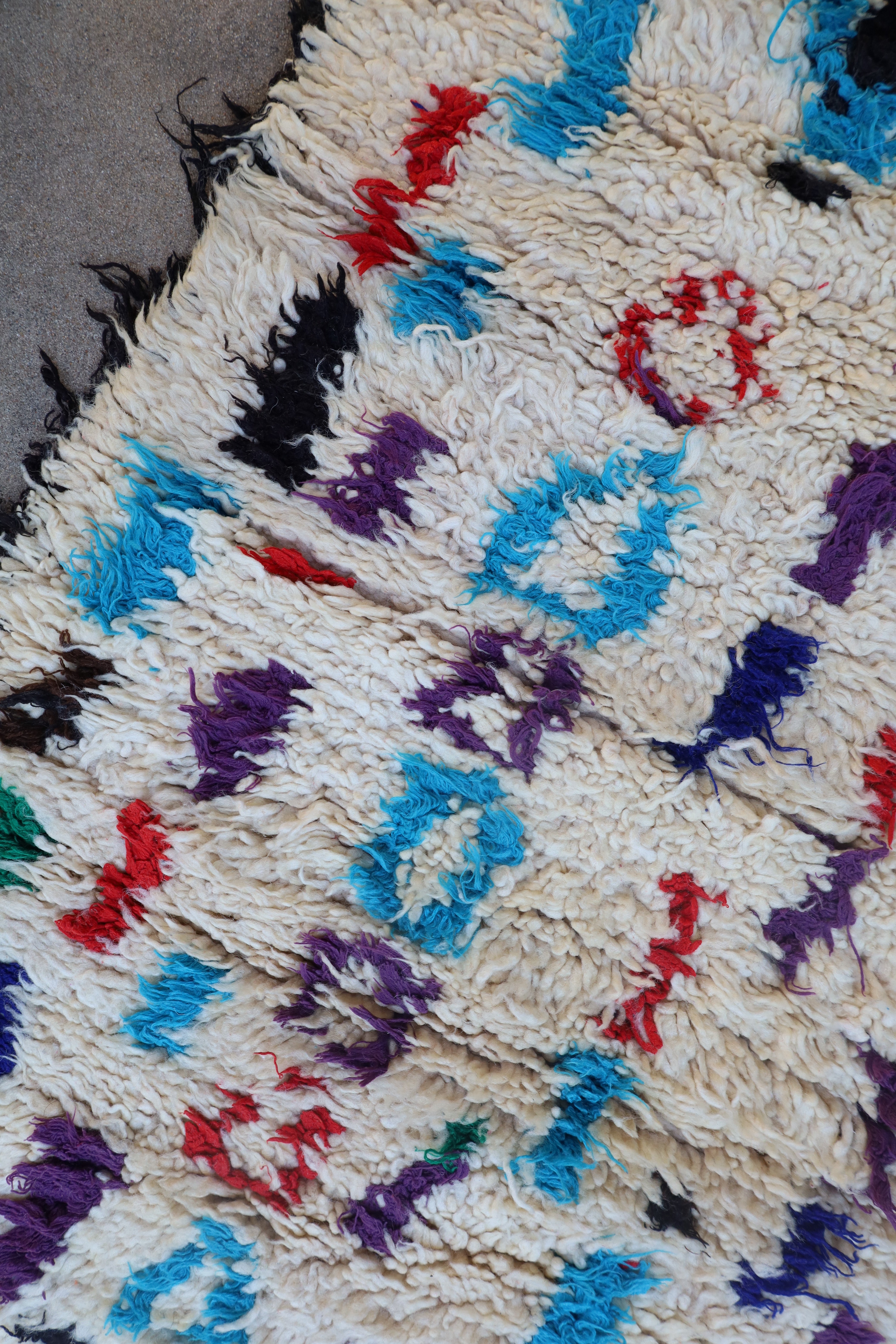 Agadir is a lovely find from the Talsint region in Morocco. Featuring a creamy background with fun color accents, this rug would be lovely hung on the wall, or on the floor in a small area where space is limited, like a bathroom.