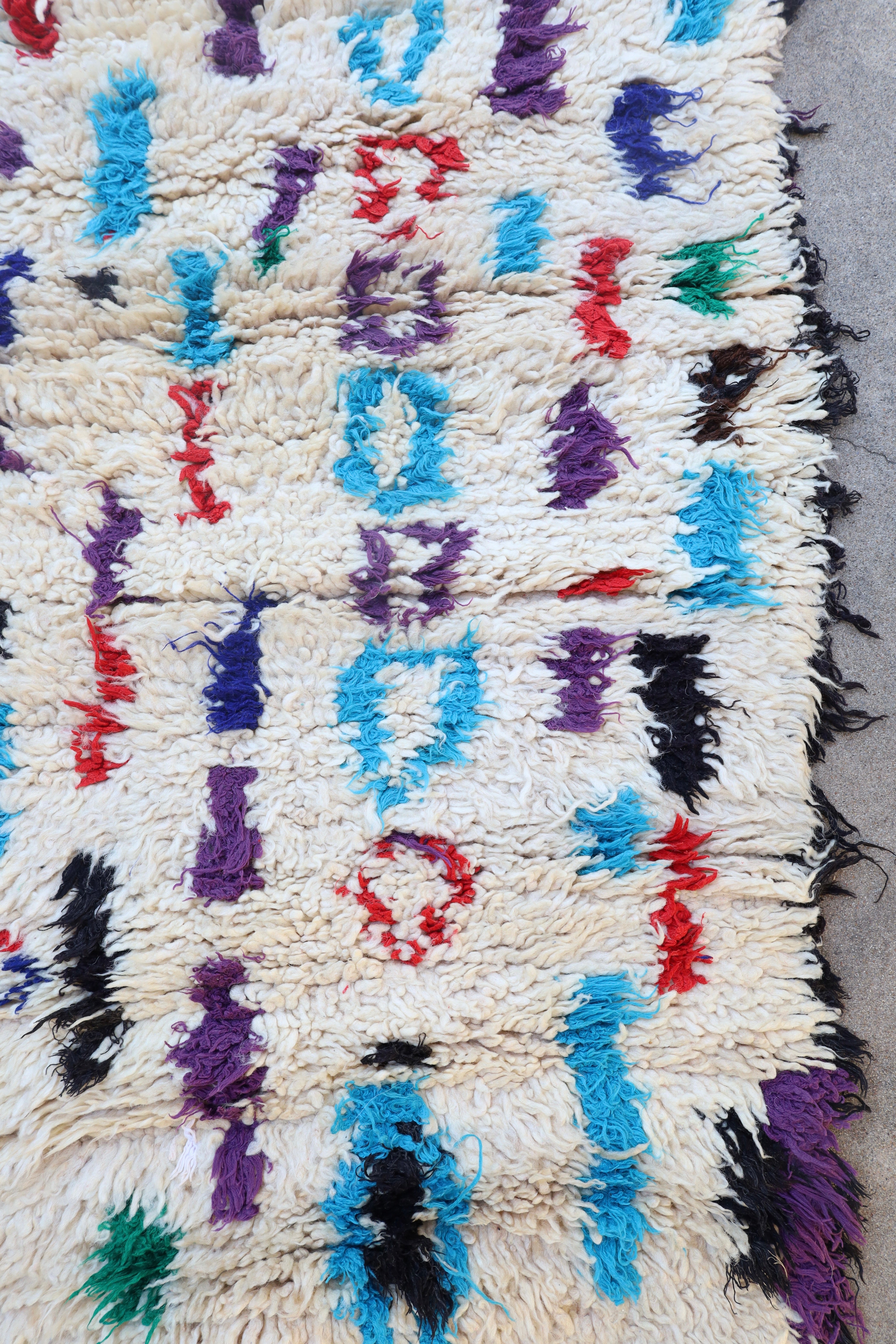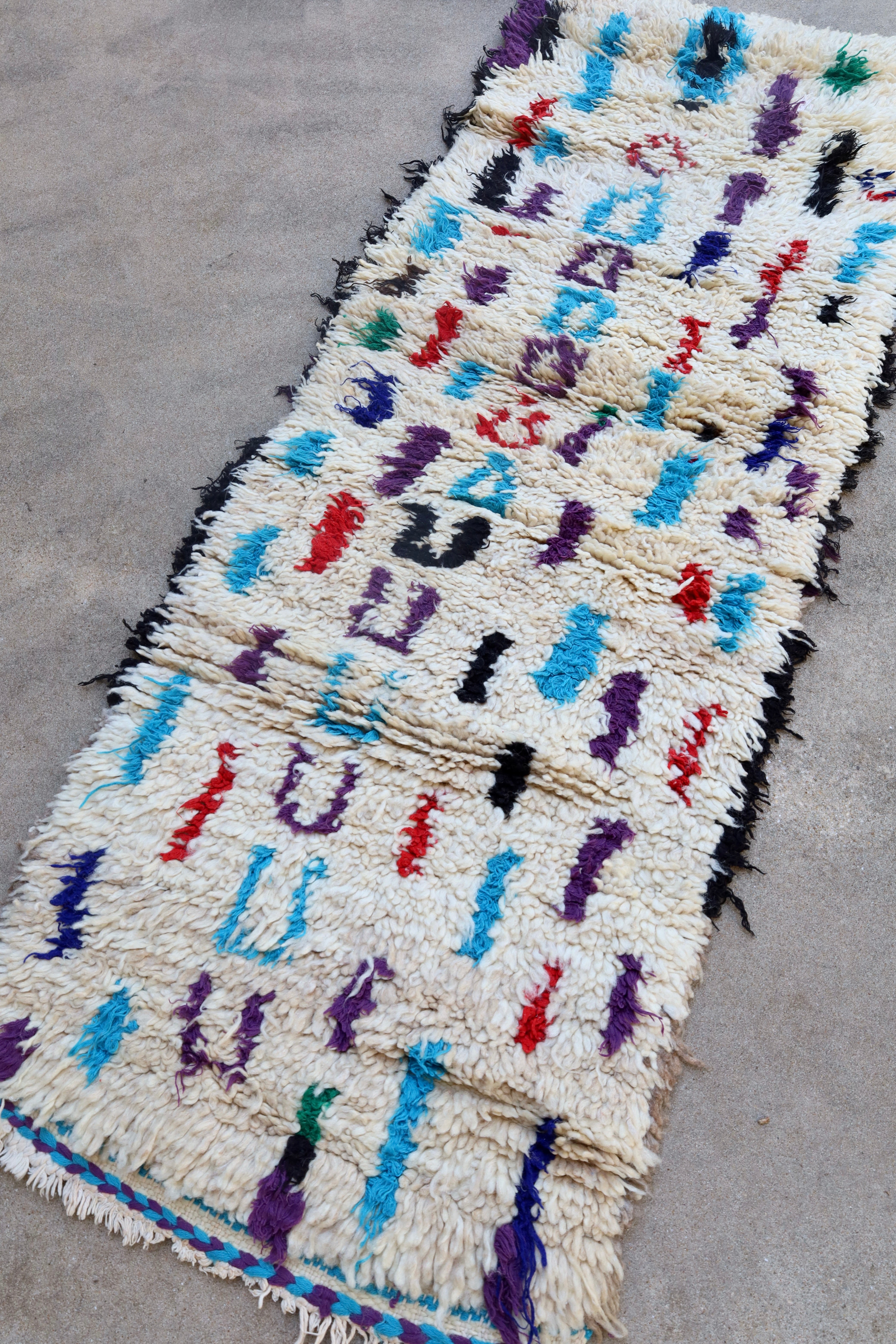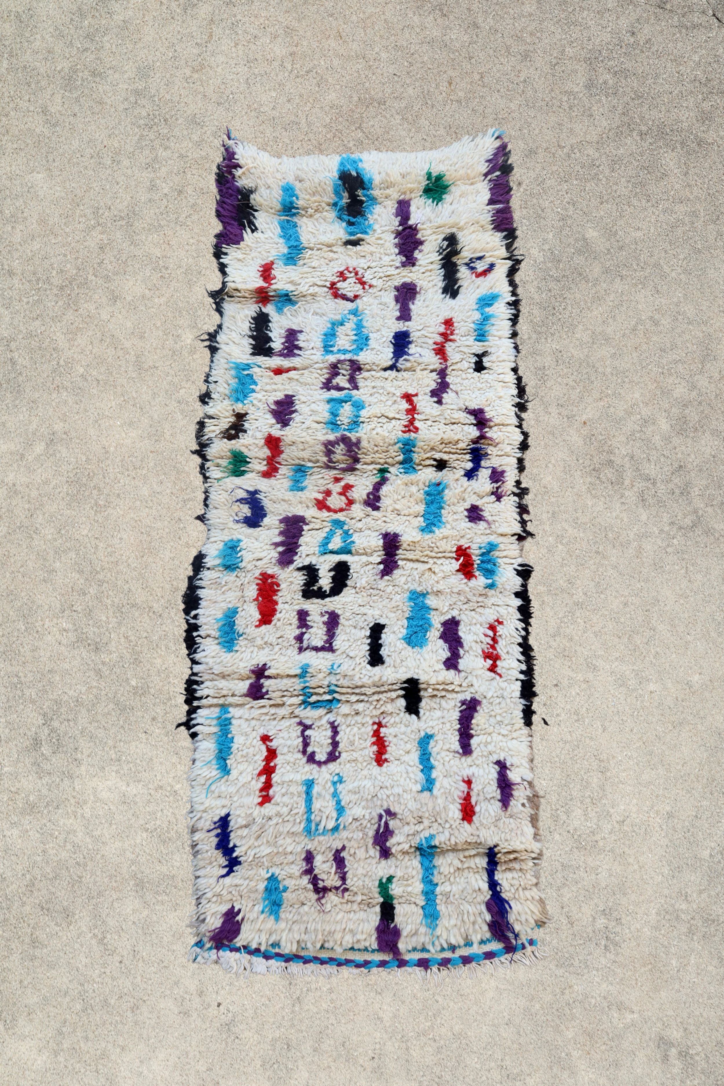 Agadir is a lovely find from the Talsint region in Morocco. Featuring a creamy background with fun color accents, this rug would be lovely hung on the wall, or on the floor in a small area where space is limited, like a bathroom.