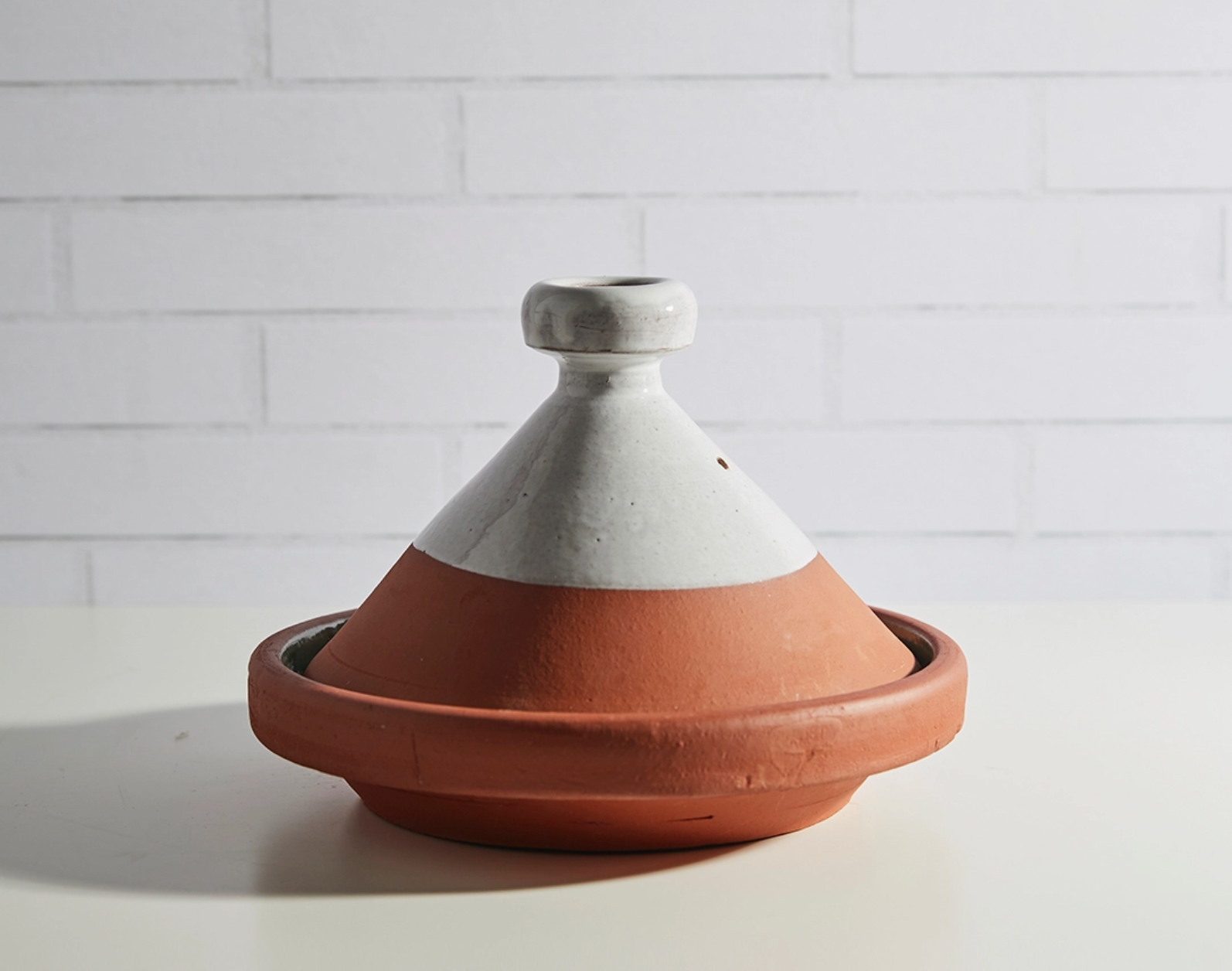 Tagines serve as both the cooking vessel and serving dish, allowing food to carmelize while cooking to stay warm for longer when serving. Each tagine is handmade out of terracotta and finished with lead-free glaze.