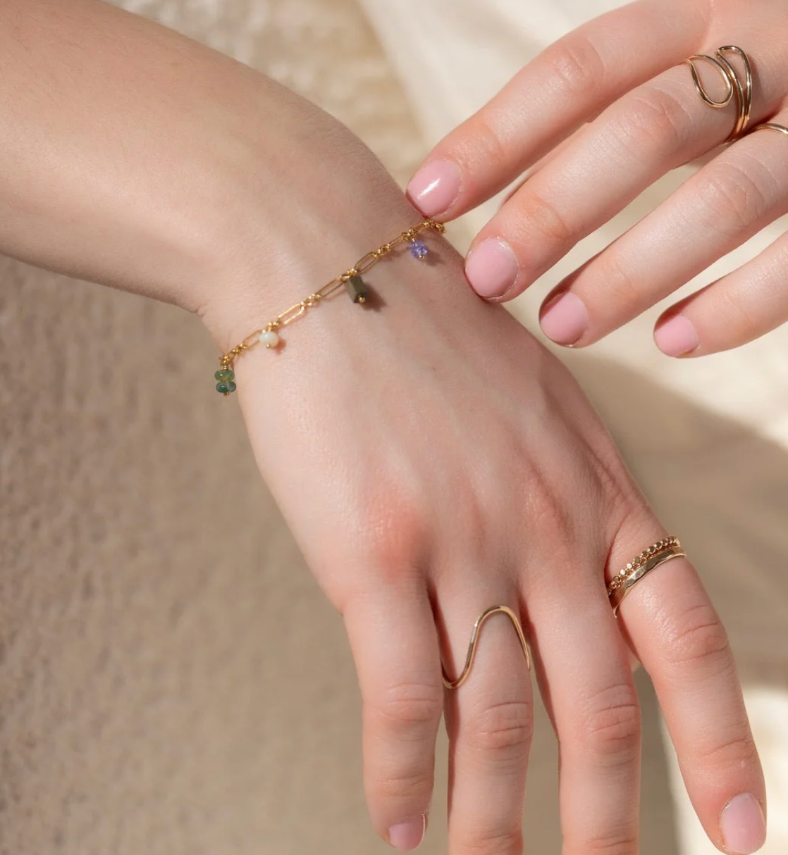 A curated mix of natural stones — Ivory Fossil Jasper, Jade, Phosphosiderite, Moss Agate, Ethiopian Opal, Hematite, and Amethyst — drape delicately along warm gold links, creating a look that feels organic, artful, and full of movement.
